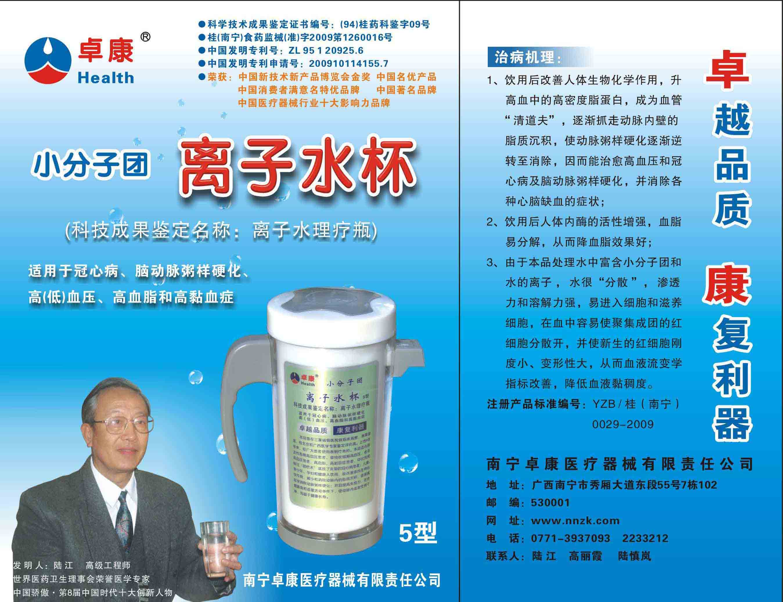 -----我是從事建筑的高工,本來沒有資格去攻克醫學難題,卻為了自身健康才扣響醫學的大門。由于我1990年患高血壓,因怕中風才研究發明了離子水瓶,我把水處理成微小分子團水,飲用后治愈了高血壓。便于1993年底送到三家省級醫院做臨床試用4個月。經北京和廣西醫學專家鑒定:"降脂降壓效果好"," 能擴大心腦動脈流量,改善心腦電圖以及微循環","對治療心腦動脈粥樣硬化、高血壓、高血脂有良好的醫療保健作用。""產品的技術性能和療效達到了同類產品的國內領先水平,經廣西醫學科學情報研究所檢索,未見國外有類似報道。"中國醫學科學院張正國教授從美國國立醫學圖書館數據庫存Medline檢索英俄文資料,均未見類似報告。2000年上市后,我為了對消費者負責而繼續觀察研究,一直通過《信譽卡》和《質量跟蹤調查書》向患者承諾療效,請用戶使用6個月后反饋效果。和脂壓患者飲用2至5個月內,消除癥狀,停服藥物,血壓正常;冠心病患者飲用3~5個月逐漸減輕至消除心絞痛、房顫等癥狀,不再服藥,飲用1年左右心電圖正常,經冠脈造影掃描無明顯狹窄,表明冠心病痊愈。大量患者還反映許多衰弱器官被修復,讓前列腺增生、慢性咽喉炎、慢性氣管炎、支氣管炎、慢性胃炎、腸炎和膽囊炎等不藥而愈;2型糖尿病患者是因為胰島衰弱致病,飲用該水半年至一年,逐漸減藥至停藥,血糖尿糖正常,真正治愈2型糖尿病。中風后遺癥患者飲用六七個月,可逐漸減輕至消除肢體和語言障礙,表明飲用該水能讓壽命很長的神經元細胞逐漸修復,奇跡般地恢復肢體和語言功能。飲用后還使胸腺和脾臟兩個重要的免疫器官被修復和增強,產生免疫細胞多,提高了免疫力,使人不生病或少生病。自此, 飲用微小分子團水創造了攻克冠心病、高(低)血壓和糖尿病三大醫學難題的奇跡。人們對此感到不可思議,但實踐是檢驗真理的唯一標準。